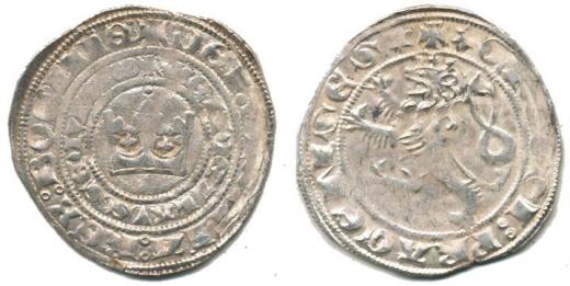 Pražský groš, var.: písmena C a D v opise WENCEZLAVS SECVNDVS puncována do razidla vylomeným puncem Hás. 19 (in.č. H5 1423 6; Num. Sborník XI/1970 str. 181-7 nález Olešník