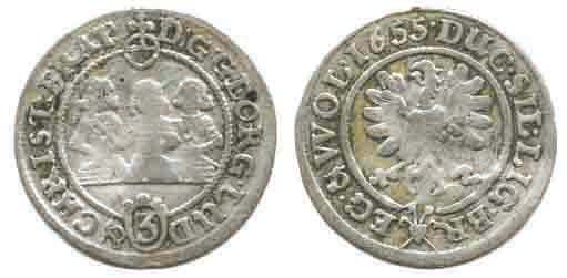 3 kr. 1655 b.zn. Sa 307 / -, tento typ neuvádí: obraz jako typ 120, ops: D:G.GEORG.LUD.() & CHRIST.FRAT. (ozdobná kartuš) / DUC.SIL.LIG.BR - EG.& WOL. 1655_mír.nedor.