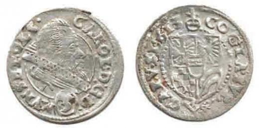 3 kr 1613 BVS, Olešnice-Sonn Sa 114/ jako obr. 28, ale port rét v přerušovaném okruží opis: CAROL. D :G. D. / erb v perličko vém okruží