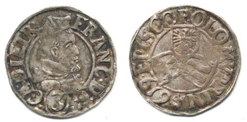 3 kr. 1619 HP, Kroměříž-Pecz SV 022 jako D3, ale DIETR. / opis začína nad biskupským znakem, datace .619_nep.nedor.