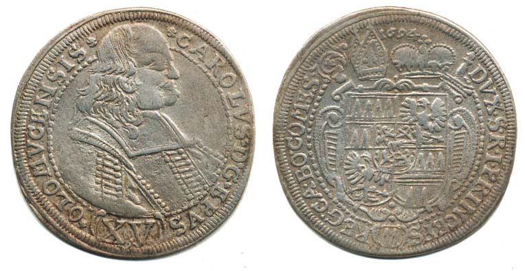 XV kr. 1694 zn. špice S-V 389 E5 hvězdička před i za hlavou, perlovcové okruží, závorka bez lístečků / D4 opis: REG. CA.