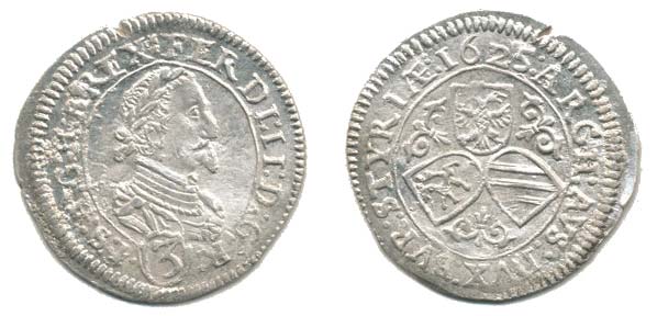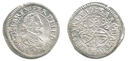 3 kr. 1625, Štýrsko Graz var.: markantně malá 2 v dataci, inter punkce dvojtečky_hr. z ražby