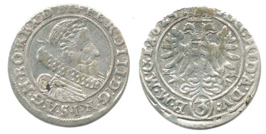 3 kr. 1625 HR, Vratislav-Riedel MKČ -, (nejblíž podobný typu 1010) výrazně úzké poprsí, opis: +FERDI.II.D:G.R.I.S.A.G.H.BO.REX .D SI / ARCHID.A.DV:()B.M.M.C.T.1625.
