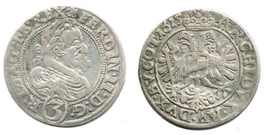 3 kr. 1625 SF, Opolí-Frenzel MKČ 1107 var.: v av. perličkov é okruží, opis: D: G.()R. / mincm. zn. po stranách hlav orlů _mělčí ražba, tém.
