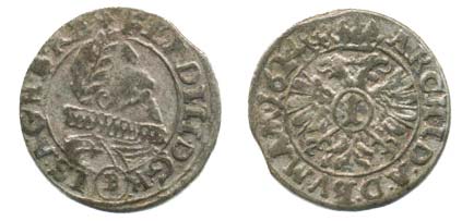 1 kr. 1624 B/CW, Brno-Wohnsiedler MKČ 891 var.: nad hlavou kříže k, opis: D.G.R () I.S...., bez stuhy za hlavou_mělčí ražba