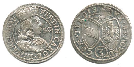 3 kr. 1650 Tyroly, Hall - var.: TYROIS (schází písmeno L)_tém.
