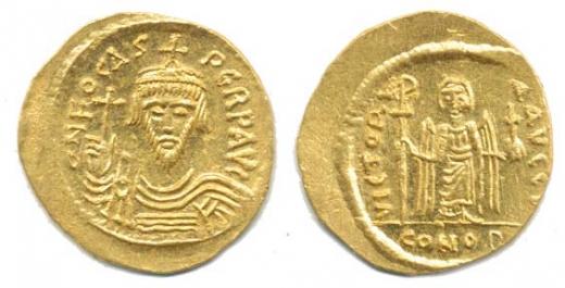 Solidus, vousatá hlava císaře zepředu s korunou bez stuh, drží kř íž na globu ON FOCAS PERP AVG / stojící anděl zepředu drží berlu s christogramem a kříž na globu VICTORIA AVGG minc. Konstantinopol CONOB Sear 618