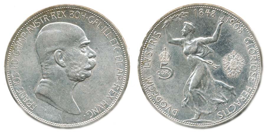 5 Koruna 1908 b.zn. - jubilejní_nep. rys.
