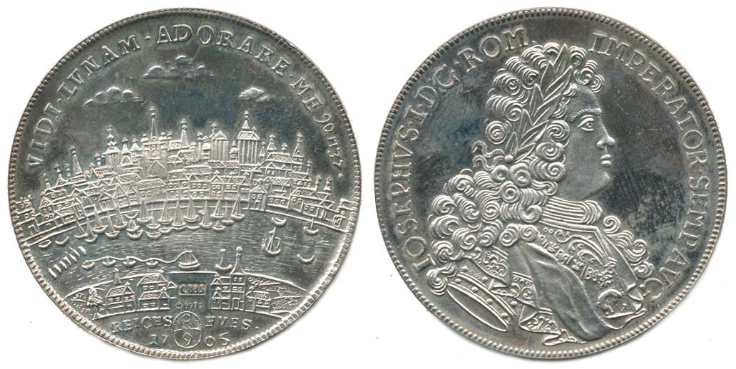 Tolar 1705 - s tit. Josefa I., portrét / pohled na město jako KM 402 "Replika 1975" Ag 835 23,25 g
