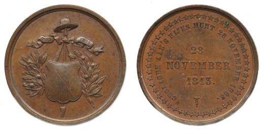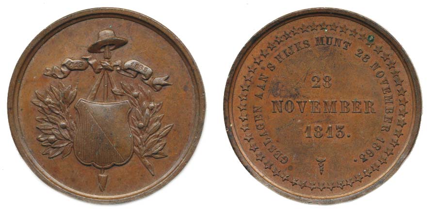Utrecht - "GESLAGEN AAN´S RIJKS MUNT 28 NOVEMBER 1863", nápis a značka mincovny / zavěšený erb,vna hrotu klobouk a stuhy s datací 1813-1863, po stranách dubové větvičky (50. výročí mincovny) Cu 35 mm