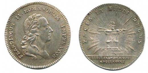 Žeton na korunovaci římským císařem 14.7.1792 ve Frankfurtu, hlav a zprava / prozářený oltář s insigniemi - Ag 22 mm odražek dukátu Förschner 406.4; J. u. F. 943b; Lanz XIV-1193; Nov. XVII/D/3b
