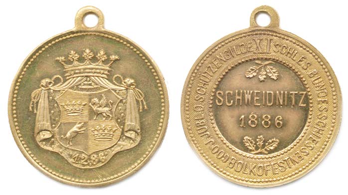 Schweidnitz (Svídnice) - XI. slezské spolkové střelby a 600. jubi lejní lukostřelecké 1886 / Erb s datací 1286, bez textu zlacený bronz 28 mm orig. ražené ouško Bur. -,_tém.