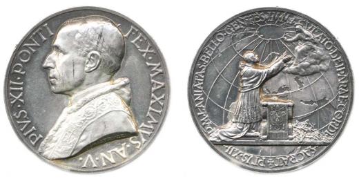 Pius XII., poprsí zleva, V. rok pontifikátu (1943) / Papež prosí Pannu Marii za národy sužované válkou sign.: MISTRVZZI Ag 44 mm 37,410 g