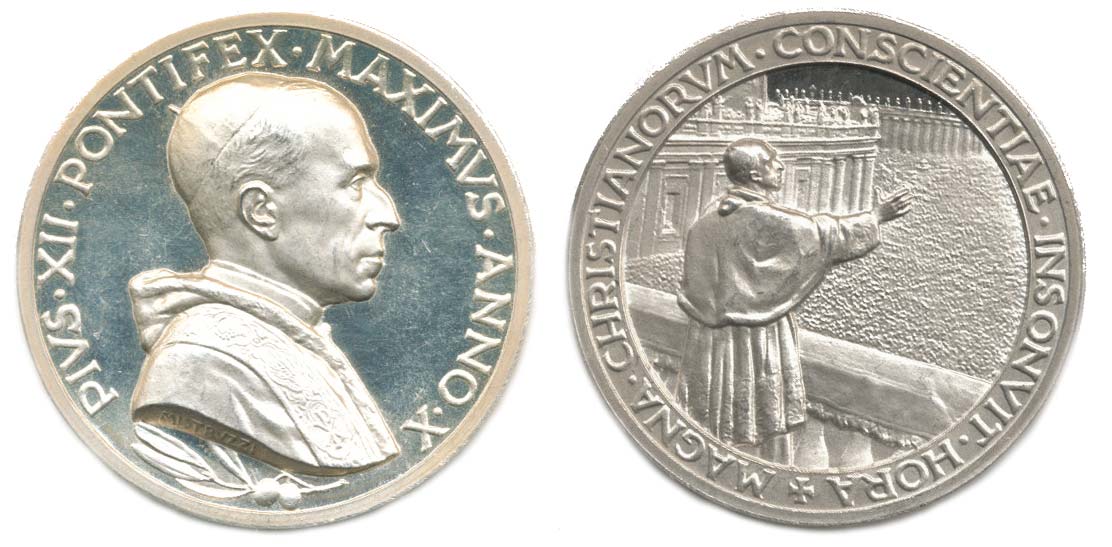 Pius XII., poprsí zprava, X. rok pontifikátu (1948) / Papež před zaplněným náměstím sv. Petra sign.: MISTRVZZI Ag 44 m m 35,562 g