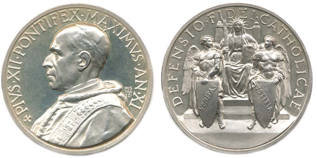 Pius XII., poprsí zleva, XI. rok pontifikátu (1950) / Alegorie ná boženství, svobody a spravedůlnosti. sign.: Mistruzzi Ag 4 4 mm 38,518 g