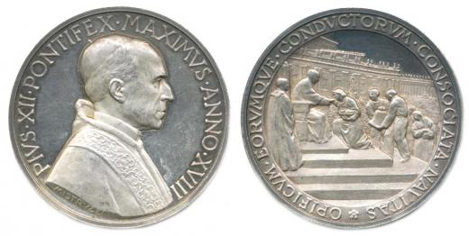 Pius XII., poprsí zprava, XVIII. rok pontifikátu (1956) / Papež p řijímá představitele Křesťanského sdružení italských pracujících sign.: MISTRVZZI Ag 44 mm 35,154 g