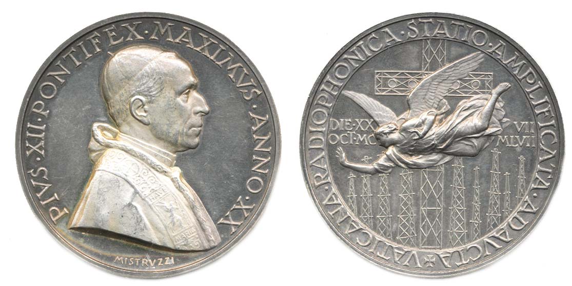Pius XII., poprsí zprava, XX. rok pontifikátu (1958) / Radio Vati kán. Zvýšení a vylepšení antén. Letící archanděl Gabriel sign.: MISTRVZZI Ag 44 mm 37,352 g
