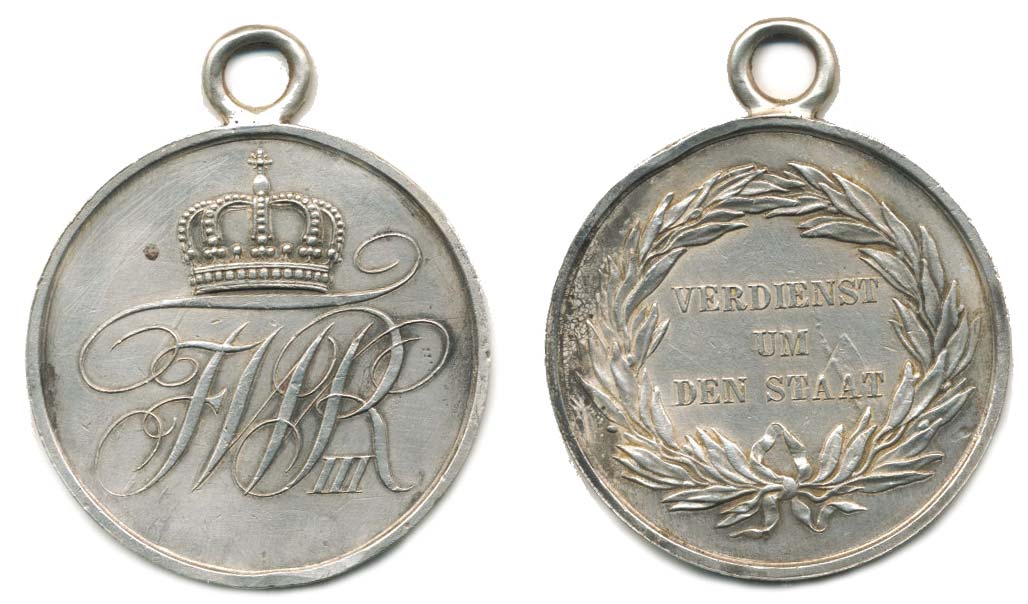 Friedrich Wilhelm III. - Záslužná medaile "VERDIENST UM DEN STAAT " 2. třída Ag 40 mm orig. ouško bez stuhy Nim. 1831 ( vyobraz. 1821)