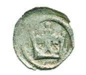 Haléř bez čtyřrázu - česká koruna v perličkovém kroužku, v otvore ch mezi liliemi hrotité výběžky Rad. I/25, Cast. 79 "RR"