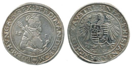 Tolar 1558, Jáchymov-Puellacher MKČ 114 var.: nad hlavou dva k roužky, opis: FERDINAN.D:G.ROM()BOEM.HVNGA.&.REX: / AVSTRI : : _tém.
