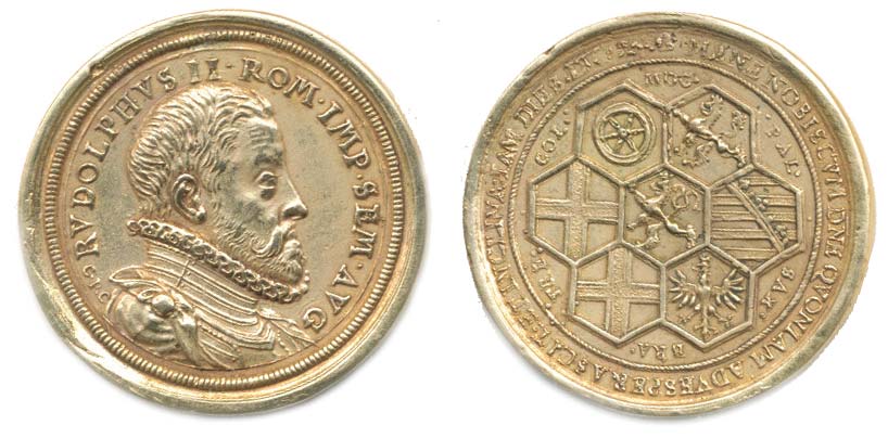 AR medaile na říšský sněm 1599 - poprsí zprava, opis/ plástev se znaky sedmi kurfiřtů, opis sign.: C.P.C. (V.Maler) zlac. Ag 32 mm 12,05 g H.1211, Don.1402 "R" podložní lístek