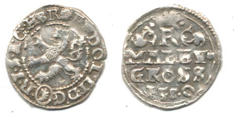 Malý groš 1580, K.Hora-Šatný HN 2b po stranách MALEY růžičky