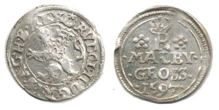 Malý groš 1597, Jáchymov-Hoffmann HN 7a/7c_zvlněn