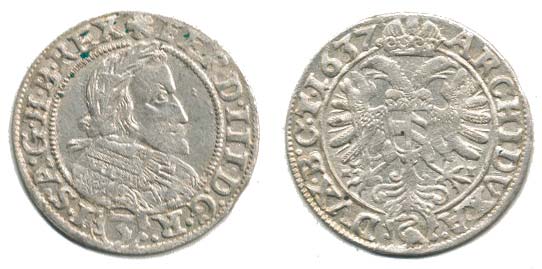 3 kr. 1637 MI+labuť, Vratislav-Reichart+Jan MKČ 1291 var.: v A v. perličkový kruh, opis: D:G.R. () I.S.A.G.H.B.REX