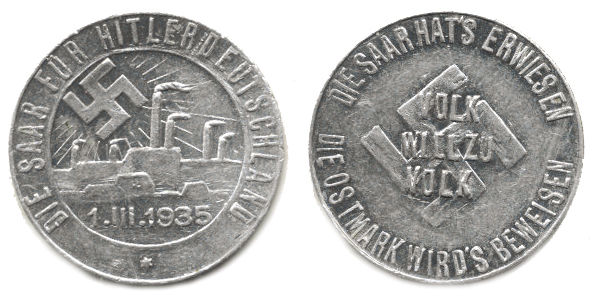 Sársko - Přihlášení k Hitlerovu Německu 1. III. 1935, av.: 3-řádk . nápis na svastice a opis / Prozářená svastika nad továrnou, opi s Al 23 mm