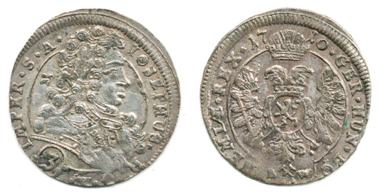3 kr. 1710 BW, K.Hora-Wohnsiedler jako MKČ 1731, ale opis: IMPER.S.A. -hlava až k okraji mince, jiný prsní štítek