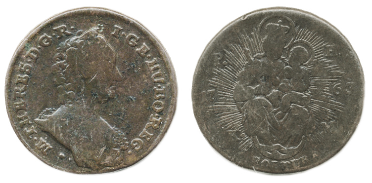 Poltura 1763 K-M +drobná růžice pod portrétem, Vídeň "R" Nov. 17 (cena T.C.)