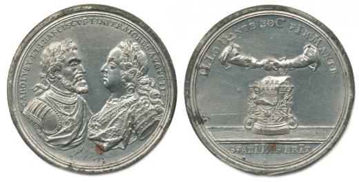 Medaile 1755 na 200 let Augsburského míru. poprsí Karla V. a Fra ntiška proti sobě / Dvě tisknoucí se ruce nad mírovým otářem s li stinou sign.: W (Worner) Schau-u. Denkmünze VXIX Sn 44 mm Cu čep pravosti