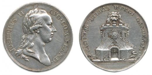 Medaile b.l. (1781), na holdování ve Flandrech, Hlava cís. zprava / Lev drží před sebou věž s bránou, opis (T.van Berckel) "R" Ag 30 mm 9.9 g Nov. XV/L-22a; Mo.2145; LG.XIV/937