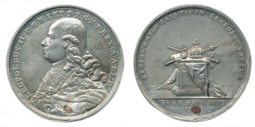 Medaile ke korunovaci na českého krále 6. 9. 1791 v Praze, Poprsí císaře vlevo a opis / Na podstavci s přehozem leží české korunova ční klenoty, opis a v úseči 2-řádk. nápis Sn 47 mm Cu čep pravosti sign. "R" (J. Ch. Reich) Nov. Q1a_rysky na hr.