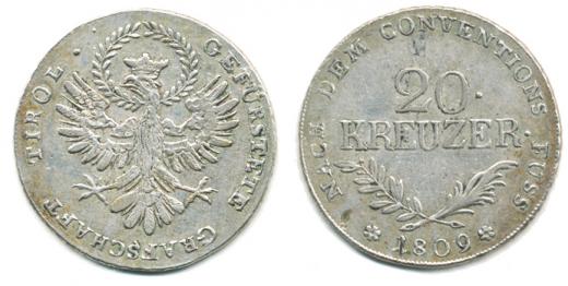 20 kr. 1809 Tyroly, Graz "R"_perf. oprav. stopa, dr., rys.