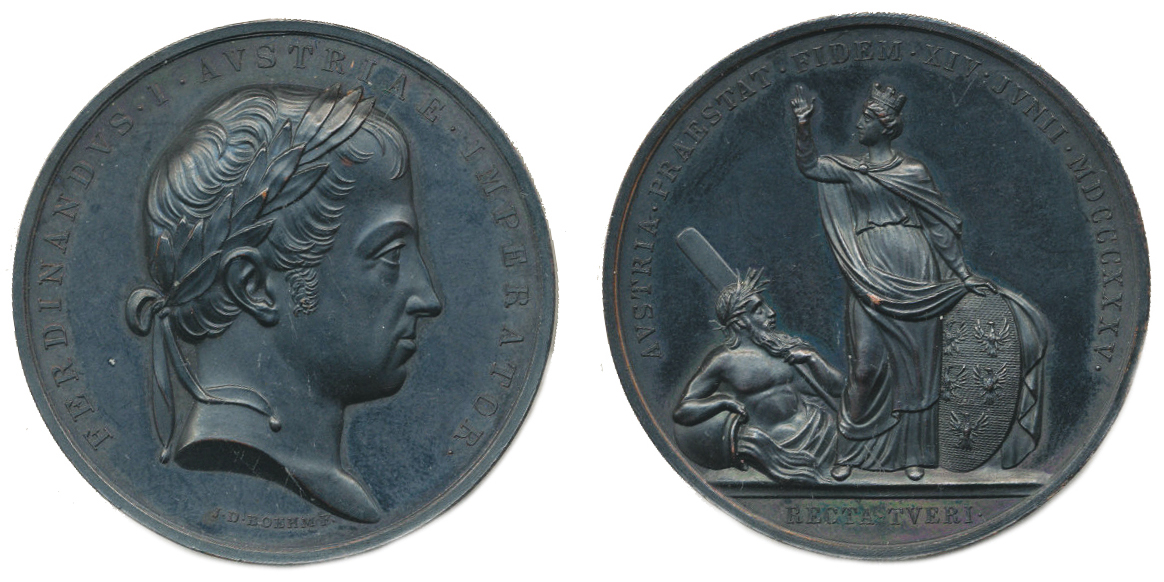 Medaile 1835 k holdování stavů ve Vídni, hlava cís. zprava / Stoj . Austria se štítem, ležící říční bůh Danubius, opis Cu s původn í tmavou patinou 46 mm Nov. VIII. c "sbírková"
