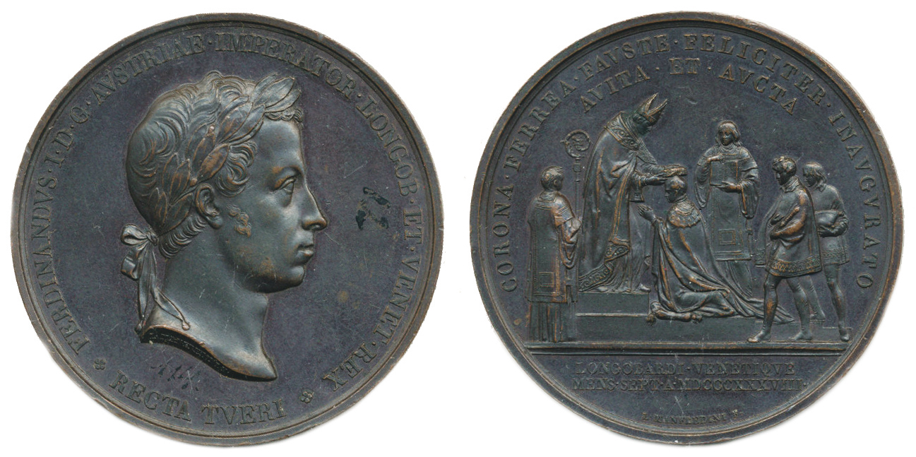 Korunovace na Lombardsko-benátského krále 6.9.1838 v Miláně, hla- va zprava / Korunovační akt sign.: MANFREDINI patin.Cu 52 mm Novák V/XVIII/G/1c; Wb. 2030; Hauser 34