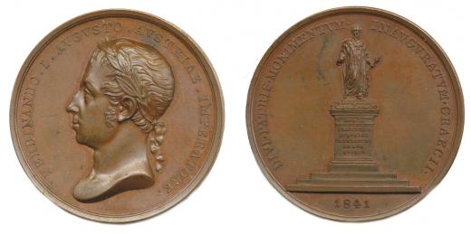 Medaile 1841, na vybudování pomníku cís. Františku II. v Grazu, Pomník na podstavci, opis / Hlava cís. Ferdinanda V. vpravo, opis sign.: SCHARFF Cu 50 mm Hauser 85; Wb. 2036