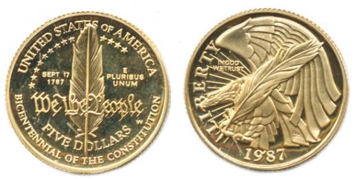 5 Dollars 1987 W - 200 výr. konstituce KM 221 kapsle