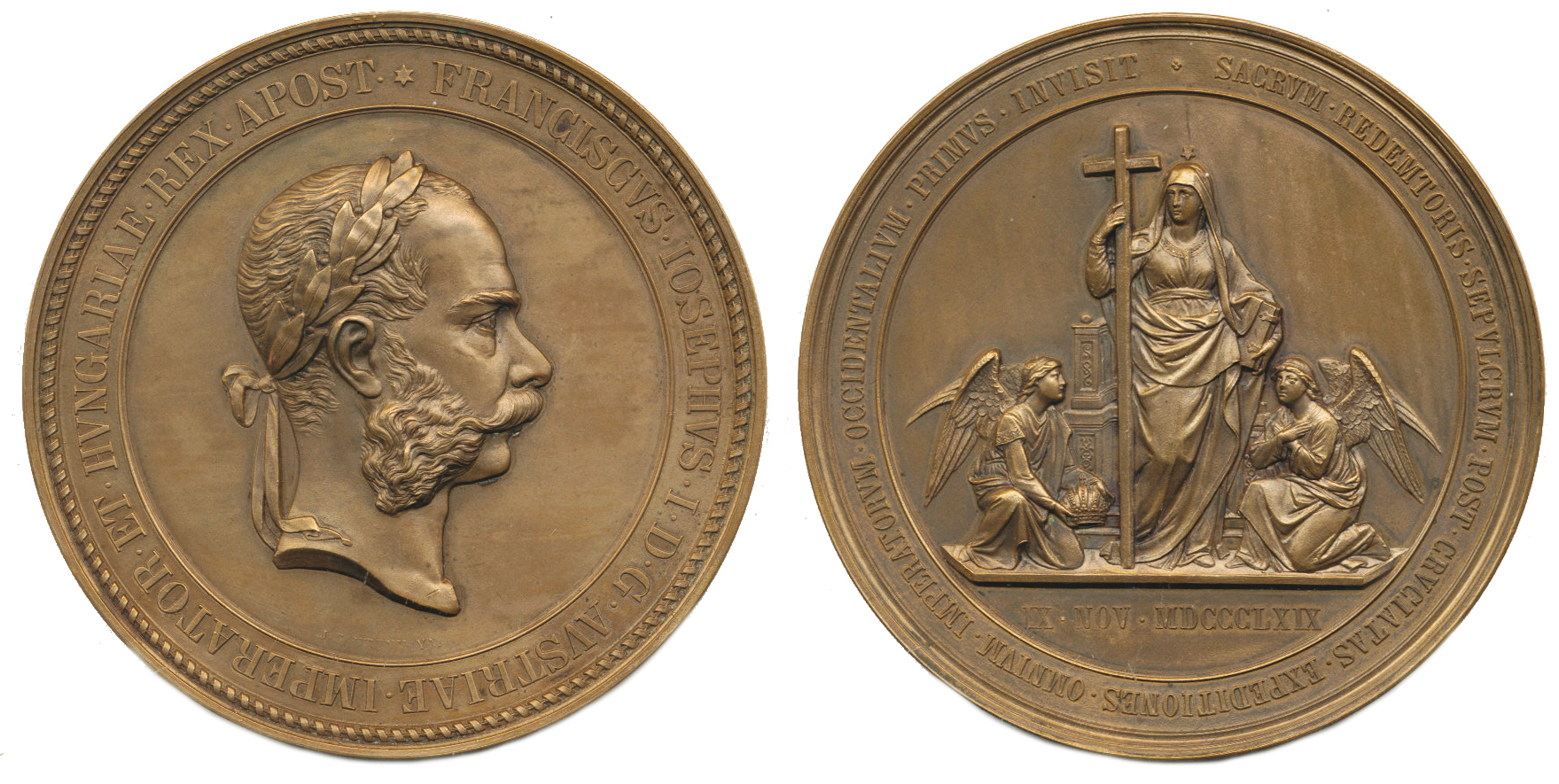 F.J.I., hlava zprava / Návštěva Božího hrobu IX. XI.1869, symblik a sign.: TAUTENHAYN bronz 72 mm "R"