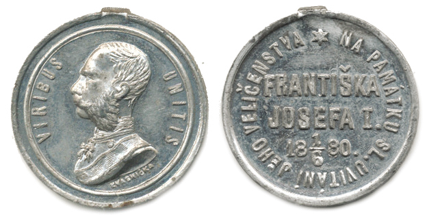 VIRIBUS UNITIS, busta císaře zleva / Na památku sl. uvitání jeho veličenstva Františka Josefa I. 1.6. 1880, tří řádkový nápis, opi s sign.: KVASNIČKA Sn 24 mm bez ouška