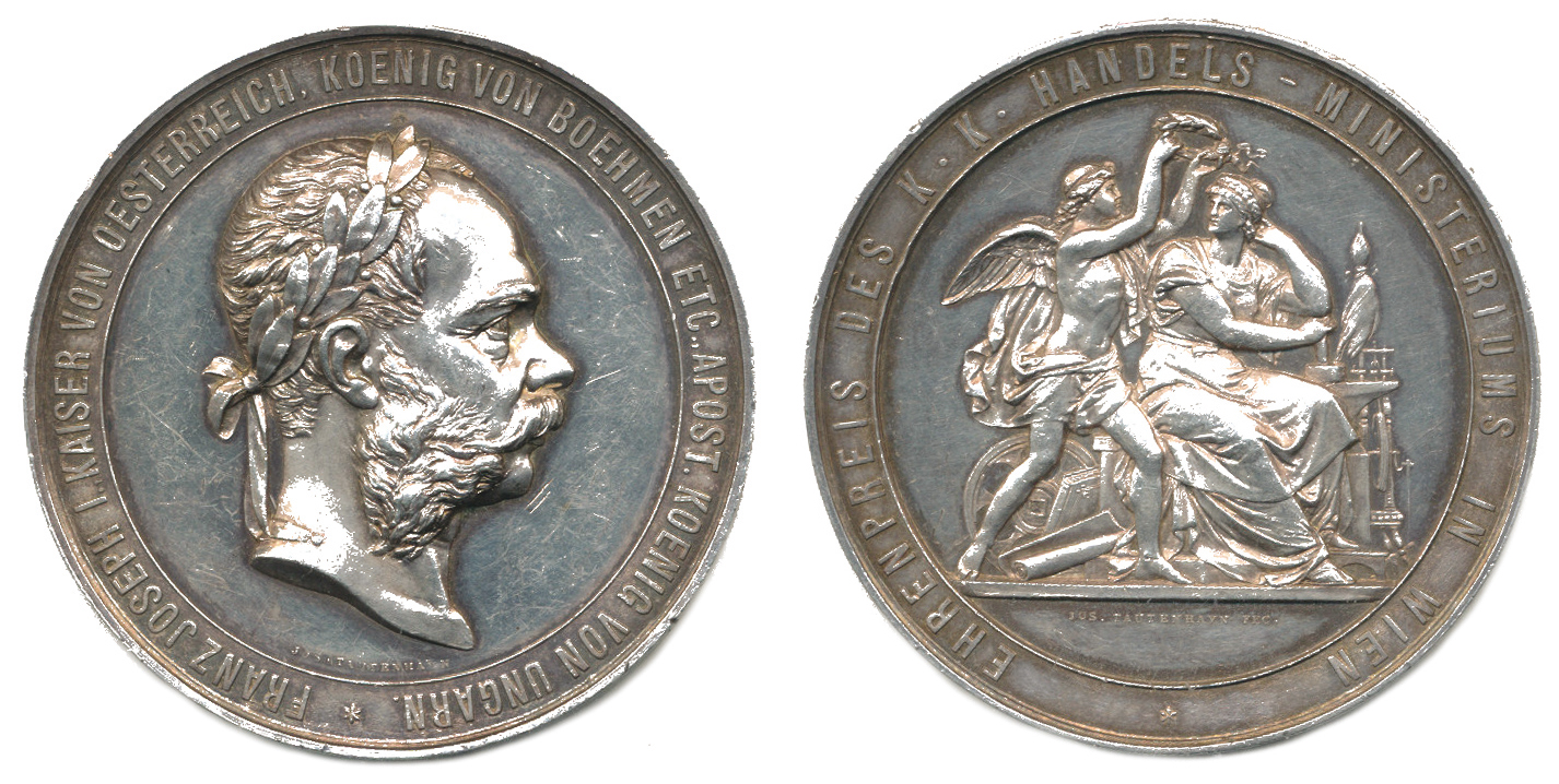 F.J.I., hlava zprava - Čestná cena c.k. Ministerstva obchodu, něm opisy, na hraně nápis: GEWERBE - AUSSTELLUNG 1886 TROPPAU (Opava) sign.: TAUTENHAYN "RRR" Ag 57 mm 70,93 g (uděleno do 5 ks !!) jako Javorský III. 6 (Ag nezná !)_dr. rys,.
