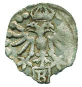 Haléř kol. r. 1500, orel v perlovci a písmeno K_poškoz.okraj