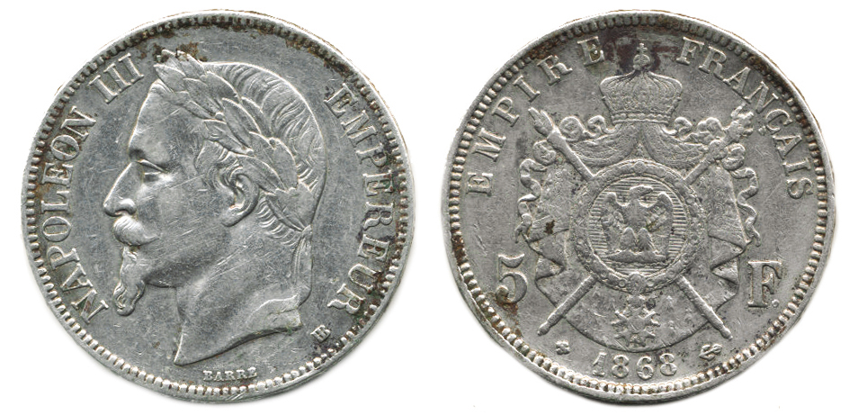 5 Francs 1868 BB KM 799,2_rys. ve tváři, tém.