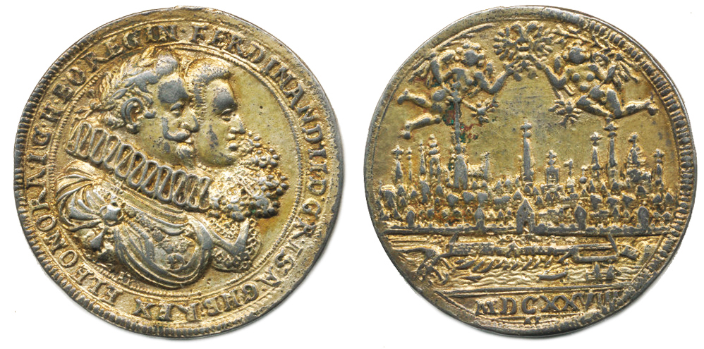 Ferdinand II. a Eleonora - Holdování města Vídně 1628, Dvojportré t zprava a opis / Pohled na město, v dolní úseči vročení MDCXXVII I sign.: A.P. (Andreas Peter) Ag 40 mm 23.7 g "R" Nov.VI/H-1a; Ho.1604; Mo.76_ stopy pův. pozlacení