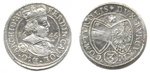 3 kr. 1646 Tyroly, Hall_nep. mělce ražen