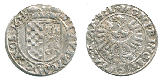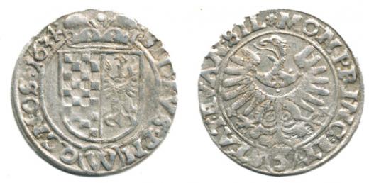 3 kr. 1634 HR/W, Vratislav-Rieger MKČ 1146 var.: (3) STAT. EV AN . SIL , ve štítu u orlice 5 plných polí, dlouhý jazyk_tém.
