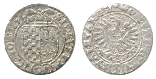 3 kr. 1634 HR/W, Vratislav-Rieger MKČ 1146 var.: (3)STAT.EVANG.SIL. - orlice s dlouhým jazykem, ve štítu u orlice 4 1/2 plných polí "R"