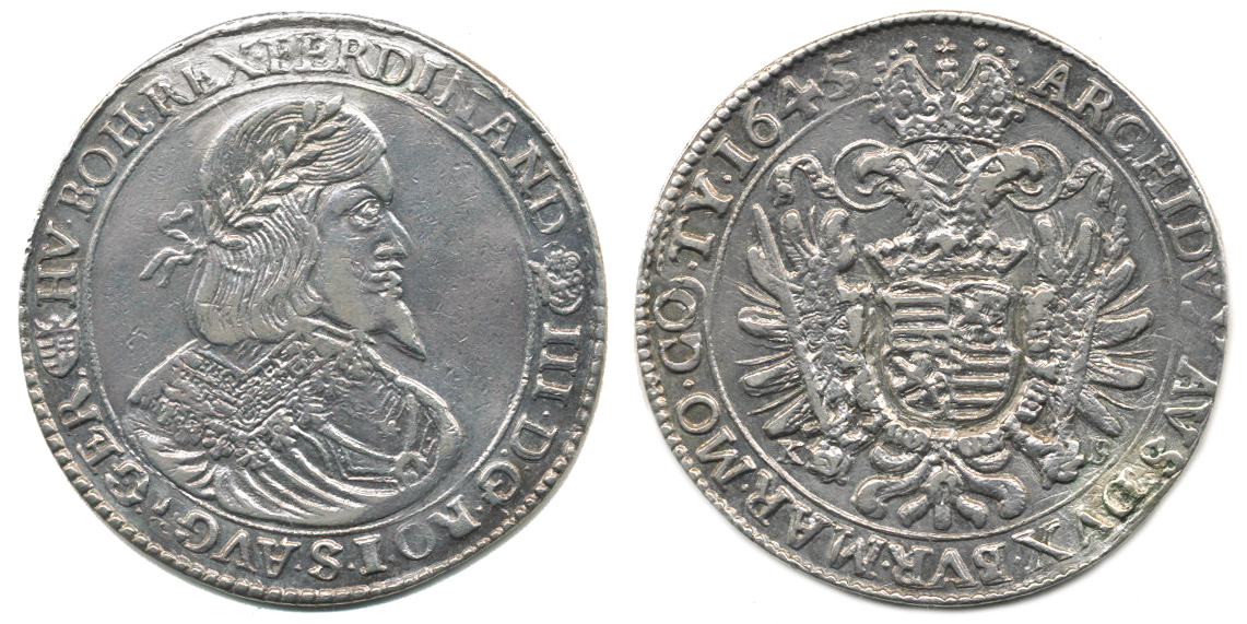 Tolar 1645 KB jako Husz. 1241, nad hlavou místo růžice tečk a / MAR. MO. CO. TY._neznatelně oprav. stopa