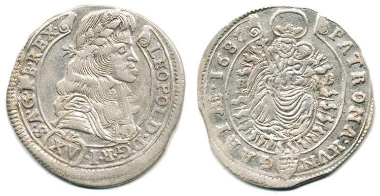 XV kr. 1687 KB Hol. - neuvádí: patrná přeražba z roč. 1686 ! typ bez křížku nad Madonou, vysoká svatozář, plameny pokračují na d erbem, bez tečky za datací podobný typu 87.1.1